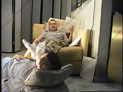 Wearing Doc Martens, sweaty white socks, waiting for foot service. He shows a letter that he found, which the man wrote. It is a confession to a fellow buddy of how much he loved the football player – Peyton & his sox & feet. Peyton reads it out loud & teases him, making many comments and teasing about the diary as he forces him to lick his shoes, smell sweaty, sox, then serve, kiss & lick his big meaty bare feet. Teasing, orders & genuine laughter for Peyton as he is amazed at this guy falling in love and worship with his athletic feet & sox. The same scene comes from two angles, one full body showing, and one close up. He wipes his sweaty feet in the guy's face, uses his head as footstool. He clips his toenails in slave's mouth. Looks at Playboy while having a footstool! Wipes bare feet in face, nose between toes, etc. Much toe wiggling in the slave's face. He laughs at the fact that he can now blackmail the guy to do whatever he wants. Lots of embarrassing moments, & Peyton's commands. Footstool at the end as Peyton watches X flix.