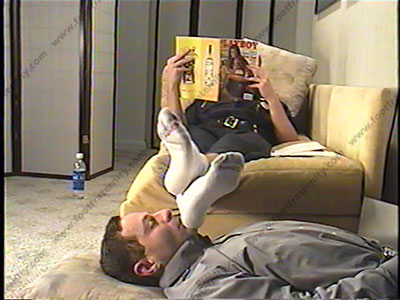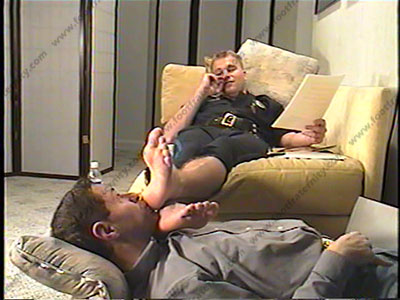 In police uniform, breeches, tall black Chippewa boots, sweaty white socks, this part time cop dominates his slave beneath his boots, socks & feet. He has a list of commands from his buddies & college friends to do to his footlicker. Peyton teases him, making many comments about the sissy slave as he forces him to lick his boots, smell sweaty, sox, then serve, kiss & lick his big bare feet. Teasing, orders & genuine laughter for Peyton as he is amazed at this guy falling in love and worship with his athletic feet & sox. The same scene comes from two angles, one full body showing, and one close up. He wipes his sweat feet in the guy's face, uses his head as footstool. Looks at Playboy while having a footstool! Wipes bare feet in face, nose between toes, etc. Much toe wiggling in the slave's face. He laughs as he washes his sweat socks in a glass of water, then forces slave to drink the water. Lots of embarrassing moments, & Peyton's commands. Footstool at the end as Peyton watches X flix.