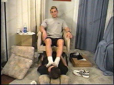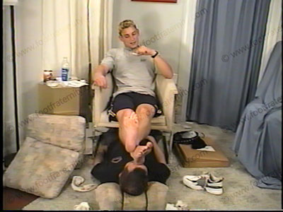 Wearing shorts, A&F T-shirt, sneakers & dirty, sweaty socks, Body Builder Bryce forces slave to smell his socks while making comments and giving dominating orders. It starts with slave bringing in package of items that Bryce ordered from a catalog and placed at his jock feet. Bryce takes each item with slave having to kiss his feet and thank him. He then orders more. He humiliates, dominates and teases him, forcing him to beg to serve & worship the feet of this jock stud. Foot kissing. Very humiliating as this 23 year-old jock body builder has his socks smelled and worshipped and feet serviced while making degrading comments, smoking & "ashing" in slave’s mouth. Then sox removed & his bare feet are in shoved in slave’s face & licked clean. Much, much toe wiggling & foot flexing in the slave’s face as his sweaty feet are worshipped. Two great views, one very, VERY close up of the feet in the slave’s face. Licking, kissing & serving Bryce’s hot, sweaty, macho feet. Super macho, hot jock talk & verbal commands mixed with lying back for adoration. Bryce decides to take over this slave’s dignity and money all for worshipping his macho feet! Total Straight, Jock foot adoration & service. He looks at the new Playboy mag while using him as a footrest. This scene is filled with mocking, teasing and Bryce laughing at his foot bitch. He "owns" him and knows it and will use his "bitch" in all ways from now on. VERY EROTIC scene, with great emphasis on his heterosexuality.
