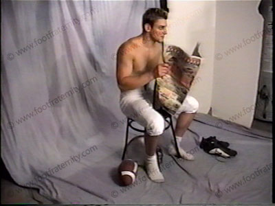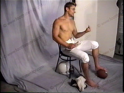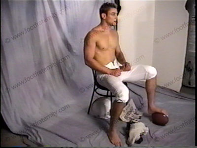 Regular guy, straight, Bryce, (with a goatee) with no shirt, football cleats, socks and pants is at the start of this true life photo session of working with this hot model. You get to see is as though you are right in the studio, watching the photos take place. Then he removes cleats, then socks for more photos. He has a perfect body and it’s fun to be a voyeur here and watch him pose. His natural shyness comes through as he is not playing a part, but rather just being himself in a posing football photo session. A regular conversation with him where you begin to see parts of his true personality come through along with what it feels like to be a straight guy who has gay men that love his body and feet. A fun tape for those into seeing what happens during a photo session with a fraternity model. The video focuses on his feet during the scene.