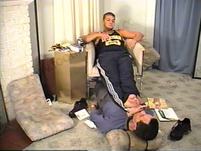 In work out sweats, wife beater sleeveless T-shirt, sweaty white socks & sneakers, this tough guy - JT has his sneakers licked then removed for sock & foot adoration as reads the notes from his team mates who saw the video of his foot slave. They have many ways to dominate and humiliate his slave. He has facial hair in sideburns that go into a small beard under his chin! Much foul language, much laughing at his bitch and much "young" hot talk from this super macho football player. He dominates & embarrasses his bitch sissy slave - domination, humiliation, verbal, teasing, then foot massage, etc. Then sock sniffing, bare foot worship. He laughs at the slave as he shows his straight superiority & wipes his feet all over the face & keeps the slave underfoot. He uses slave’s head as a footrest. Two angles of this scene, one from a close-up camera. Lots of verbal hot talk & much teasing. His smart-ass" attitude is hot and erotic throughout. He laughs at the commands from the team and does them to his slave. JT then reads his hot Playboy mags, using his slave as a footstool. Solid hot talk, answering comments & embarrassing his foot slave. His commands are tough, humiliation & very macho – filled with tough, street language! He likes this worship and action and laughs at the humiliation of the slave bitch under his feet, who has to pay for it.