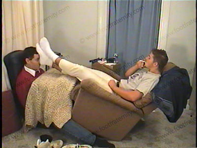 In football pants, white socks and half T-shirt, JT comes in after a game of football. His bitch has to smell his white socks while JT relaxes with his feet in his slave’s face. He is lounging in a Lazy-boy recliner with his feet pinning the slave to the wall. He humiliates, dominates and teases him, forcing him to beg to serve & worship the feet. Foot kissing. Very humiliating as this jock athlete has his socks smelled and worshipped and feet serviced while making degrading comments, commands and orders while smoking. Then sox removed & his high arched, athletic meaty bare feet are in shoved in slave’s face & licked clean. Much, much toe wiggling & foot flexing in the slave’s face as his sweaty feet are worshipped. Lots of foot mashing in the slave’s face! Two great views, one PERFECT close up of the feet in the slave’s face. Licking, kissing & serving JT’s hot, sweaty, macho feet. Lick out toe jam, sucking toes, etc! He steps in a chocolate cream pie to let it ooze between his toes in order to have them licked clean. Super macho, hot jock talk & verbal comments. JT decides to dominate in his own way and does just what he wants. At the end, JT just ignores slave as he sticks his foot in his face while watching straight flicks, then has bitch care for a sports callus on his macho foot, with a pumice stone and licking.