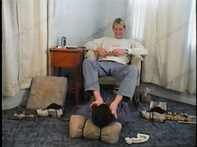 In jeans, sweat shirt, white sweat socks, & sneakers, this tough blonde/blue German guy - Draven has his sneakers licked then removed for sock & foot adoration as he gives humiliating orders & embarrasses his bitch sissy slave - domination, humiliation, verbal, teasing, then foot worship, etc. He has some notes from his football team with questions and orders to give his foot slave as the Master commands sock sniffing & high arched bare foot worship. He makes another tape for the team (talking to them by name) to watch the humiliation of his sissy foot slave. He laughs at the slave as he shows his straight superiority & wipes his feet all over the face & keeps the slave underfoot. He uses slave’s head as a footrest. He puts his cigarettes out on the slave’s antique table! "ashes" in slave’s mouth. Two angles of this scene, one from a close-up camera. Lots of verbal hot talk & much teasing. Draven is arrogant, dominant, and uses his slave as a footstool & ashes in slave’s mouth. Much barefoot in the face. He teases, humiliates and dominates using this information. Solid hot talk, answering comments & embarrassing his foot slave. His commands are tough, humiliation & very macho – filled with tough & teasing. He orders champagne treatment as slave pours good champagne all over Draven’s hot sweaty feet. Constantly wiping his feet all over his sissy slave’s face and humiliating him. He is a NATURAL dominating very straight top and Master. Solid hot talk from this German god. (Barefoot scenes from the beach at the end of the tape.)