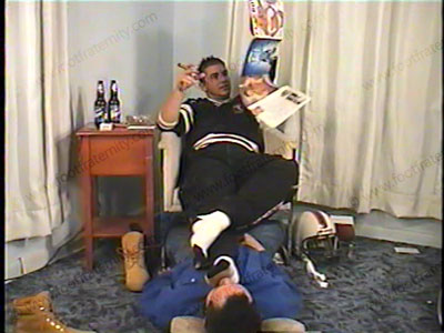 In sweat suit, Ralph Lauren white sweat socks with black cap heel and toe, & boots, this tough jock football player – JT, has his Timberland boots licked while he talks about football. He just got back from a game and tells about it while having a cigar and "ashing" in his slave’s mouth. After the full view scene, we see the ACTUAL high school game in which JT scored the game winning touchdown! He is number 66 in his uniform and the camera does much action finding him in the game. It gets the touchdown on tape, and all the team cheering and hugging after it! Great film footage of his high school game! While at home, he has his boots removed for sock & foot adoration as he gives humiliating orders & embarrasses his bitch sissy slave - domination, humiliation, verbal, teasing, then foot worship, footstool, etc. The jock commands sock sniffing & high arched, meaty bare foot worship. He laughs at the slave as he shows his straight superiority & wipes his feet all over the face & keeps the slave underfoot. He uses slave’s head as a footrest. Two angles of this scene, one from a close-up camera. Lots of verbal hot talk & much teasing. JT is arrogant, dominant, and likes to laugh at his bitch and uses his slave as a footstool. Much barefoot in the face. He teases, humiliates and dominates, spits, etc. Solid hot talk with much football talk, answering comments & embarrassing his foot slave. His commands are tough, humiliation & very macho – filled with tough, along with much teasing. Constantly wiping his feet all over his sissy slave’s face and humiliating him. Much teasing with his macho, Italian feet! His youthful arrogance is very erotic! Then expensive champagne poured over his hot, sweat bare feet to cool them. More close up JT foot worship at the end of the scene. Watch for #66 in the football game and you will see this stud in action!
