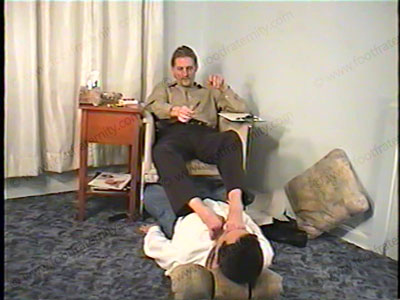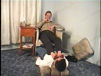 Dressed up from the office in black lace up shoes, dark socks (with a thread bare worn hole in the sole), Draven (wearing a goatee), first has his slave lick his shoes. He decides to make a video for his buddy to show how he can dominate and humiliate a sissy slave. Then slave has to smell sweaty socks and have them wiped all over the face. Draven gives all kinds of commands, teasing and orders to his wimp slave. Then he has socks removed to wipe his sweaty bare feet in slave’s face. Foot kissing, licking, toe sucking, "ashing" and spitting in slave’s mouth, etc. He talks to his buddy as he sets the orders for the future & laughs at the foot worship from his slave. He give all sorts of humiliating commands and orders to mock his slave in front of his friend. Very humiliating while he gives all sorts of foot worship commands & orders. This blonde, German hot guy, has his socks smelled and worshipped and feet serviced. Then sox removed & his bare feet are in shoved in slave’s face & licked. Much, much toe wiggling & foot flexing in the slave’s face as his sweaty feet are worshipped. Two great views, one very, VERY close up of the soles of his feet in the slave’s face. Draven takes slave’s recent store purchases from him & makes him kiss his feet for taking it. Then slave must kneel to be footstool with Draven’s smelly socks in the face. He uses head as a footrest! Draven laughs at him as the domination, teasing & humiliation continues. Verbal abuse and foul language given by this hot, very attractive stud. Also, many foot fetish surprises in this tape – VERY HOT!