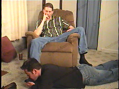 In jeans, penny loafers, sheer dark socks, Draven (in a goatee), sits back to watch his favorite sports show on TV while Shawn lick his shoes, smells his sweaty sheer socks and caresses his hot, high arched bare feet. Draven ignores Shawn, who loves to make love to his feet. This blonde, German hot guy, has his socks smelled and loved and feet serviced. Then sox removed & his bare feet are in wiped in slave’s face & licked. Two great views, both with camera men zooming in and out to show all kinds of very, VERY close up of the feet in the guy’s face. Licking toes, between them, the soles, everything. Then Shawn then kneels to be footstool with Draven’s bare feet on his back. VERY HOT foot love to a hot straight stud, as Draven just sits back and takes the love to his feet!