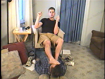 In a tight black T-shirt, shorts, sweaty white socks & sneakers, this hot, extremely cocky, eighteen year old straight guy get his first fan letter from a famous celebrity who is in love with his feet. He gets a major "high" to discover that someone famous wants desperately to be his foot slave. He reads the fan letter out loud and talks to the famous guy in the camera as he laughs and teases and as he responds to this new power. He gives humiliating comments & embarrasses this guy while he has his foot bitch serve his sweaty white socks and perfect 18-year-old’s bare feet - domination, humiliation, verbal, teasing, then foot worship, footstool, etc. The Master has sock sniffing & high arched foot worship as he responds to this guy, telling him all that he will do to him. He laughs at the slave as he shows his straight teenage superiority & has his perfect male feet all over the face & keeps the slave under his feet. Total sock and bare foot in the face. He teases, humiliates and dominates, and verbal abuse and constantly snickers and owns the control, using this information. Shoves his toes and feet hard into the bitch’s face. Two cameras – one VERY close ups and one full-length view of this erotic, hot, dominating scene of a very hot, straight jock! He loves the power that he now realizes he has. Very youthful and flawless verbalization and teasing, smoking, ashing in mouth, spitting, etc. Totally teases, dominates and embarrasses with feet constantly, as he takes the role of the god of the foot slaves & this celebrity from the Fraternity. He is EXTREMELY cocky in attitude. Parker has his feet & socks cleaned of sweat with water, and then the slave has to suck up the water through a straw while his feet are still in the soak. Mocks his bitch slave constantly like a teenage guy would do it. He LOVES the power at his feet, really loves it.