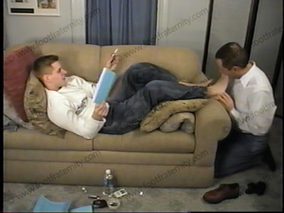 This teenager does humiliating & dominating, mostly friendly teasing, all verbalization of his foot "bitch." In jeans, lace up shoes, sheer navy blue socks, Parker reads the GPW newsletter about slaves serving at the feet of college jocks. He is lying on the sofa with his slave on his knees at his feet. He laughs about the weekend, making many cocky comments while making slave sniff his sweaty thin sox making him a sissy slave. Solid foot/face contact as he reads the newsletter from the GPW (gay pride-less weekend) of straight men who have slaves beg on their knees to be treated like crap & pay to be dominated. Verbal abuse & hot talk. Hundreds of humiliating ideas as he totally dominates his sissy bitch slave. He thinks it's really funny & plays with the idea, deciding that everything has its price, & he may be available. He laughs at the slave as he shows his straight teenage superiority & has his perfect male feet all over the face & keeps the slave under his feet. Total sock and bare foot in the face. Much sniffing and licking between the young jock’s sweaty toes. He teases, humiliates and dominates, and verbal abuse and constantly snickers and owns the control, using this information. Shoves his toes and feet hard into the bitch’s face. Parker has his bare feet & toes kissed, sniffed, sucked, licked & serviced. He comes up with ideas of his own and he dominates his bitch in a commanding, cocky, arrogant, teasing manner. He takes slave’s expensive baseball card and burns it before him and laughs as his ability to do anything, then makes slave pay for the ashes of the expensive card. He realizes that he has more control simply because he is straight and has hot feet. Solid foot in the face. Verbal talk & teasing. Short clip at the end of Parker stepping in a cake and having a slave lick it up, and then clean up his feet afterwards! VERY HOT!