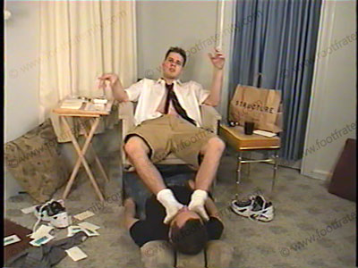 The board game that has been invented for foot slaves & his Master. Rolling the dice, Parker picks from the various piles of "action or question" cards and follows the directions on the card. Each card has a score value. Parker follows the actions & humiliates him, embarrasses him and much teasing his bitch, while playing the game. Bare-chested, with an open white shirt, loose tie, shorts, sweaty white socks & sneakers, (very Abercrombie & Fitch style). This 18-year-old laughs a lot at being able to humiliate his sissy slave beneath his feet. Lots of begging. Sock action, foot kissing & licking, spiting and MANY other happenings. Parker gives great verbalization & domination, (with much foul language & laughing) which is embarrassing as he treats him like crap. He laughs at the slave as he shows his straight teenage superiority & has his perfect male feet all over the face & keeps the slave under his feet. Total sock and bare foot in the face. Makes slave talk to his buddy on the phone and confess his worship to his feet as well. Much sniffing and licking between the young jock’s sweaty toes. The cards are scored after the game. This tells what prize the slave must give to Parker for the humiliation & foot/sock action! Hot responses to the playing cards! Foot & sock action, then barefoot action. Intense foot domination. He does EVERYTHING imaginable to his bitch slave. Ashes in his mouth, much teasing, humiliation, stands on him, takes his phone calls while his feet are being licked, laughing at him. He is a real straight, dominating, teenage jock! He is young, cocky, and arrogant & loves to tease to a foot sissy. He believes that they were born to serve heterosexual young jocks. His high arched feet are flawless & he knows how to wipe them in a sissy’s face for hours and days! We are at Parker’s mercy to serve his feet for eternity. VERY HOT GUY. After the game is an interesting video of a hot studio photo session with this arrogant, cocky 18-year-old jock.