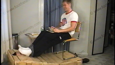 Taylor has his bitch lick sneakers, smell his white sweat socks after coming back from a basketball game. He tells his friend, Adam, all about how he dominated sissy foot slaves under his feet. He has slave locked in a box with a hole cut in it for only the slave’s face to show through. The sissy’s face can’t move and must take all that Taylor’s feet dish out. He torments and mocks his slave, teasing him and laughing at the power he has. He humiliates him, embarrasses him as he wipes his feet all over the slave’s face! Taylor is wearing white socks, and in uniform. This basketball player jock laughs a lot at being able to humiliate his sissy slave beneath his feet in all kinds of ways. Sock action, foot kissing & licking and MANY other happenings as slave is embarrassed. Taylor gives great verbalization & domination (with laughing & much teasing) which is embarrassing to the slave, as Taylor treats him like dirt. Total foot domination. He is so amused as he does it to his bitch slave. Solid foot/face contact throughout the entire scene. He spits in slave’s helpless face. Verbal teasing and laughing throughout the scene. He even stands on the slave’s face. He teases with much laughter and loves the hero worship that he gets for being a star basketball player. He comes up with many ideas of how he will dominate his slave and make him pay for it. Perfect size 13 high arched bare feet in the face constantly! The slave’s face is literally locked in place and forced to serve foot in the entire scene. Two views, one close up of the feet in the face and one full view. He demonstrates all that he can do to his slave for Adam to see. At the end, he finds catalogs and forces the bitch to order everything that he circles in the J. Crew catalogs!