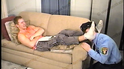 Taylor in work out sweats, basketball shirt, basketball sneakers & white sweat sox finds some blackmail photos of the cop who just gave him a ticket. The cop shows up at the dorm of Taylor who pissed him off, comes in to create the new rules and to put the "law" under his feet, socks & shoes. He embarrasses him by much foot action, licking, toe sucking, spitting, sock sniffing, footrest & footstool to this 20 year old guy’s feet. The cop will be serving Taylor and his buddies from now on. He humiliates the cop at his sweaty sox & feet. He blackmails him and now the cop has to do whatever Taylor wants. This athletic jock forces the authority to submit to the power of this athlete. He hates cop-pigs and now can humiliate him. Taylor laughs his butt off as he has the cop by the balls. He will not return the photos, and the cop agrees to be his total foot slave. Makes the cop into his human footstool. HE LOVES the ideas of putting police under his jock feet. He REALLY likes it! He is extremely arrogant, cocky and uses total verbal abuse & foul language on the pig. He owns the cop now. He makes the cop pay for the honor of serving his sweaty shoes, socks & feet. He completely humiliates, dominates & now "owns" the cop. At the end, he tramples all over the cop, walking on him while wearing sneakers, then in his sweaty socks. The cop must take the weight of being trampled under the feet of this jock. Two views, one close up of the feet in the face and one full view. He demonstrates all that he can do to his slave pig/cop. Then rubs his sweaty bare feet in the cop’s face for a while, total foot service! VERY HOT!