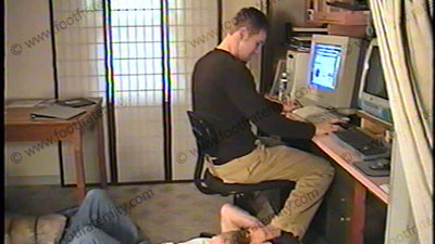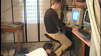 In the dorm room, wearing Khaki slacks, dark socks & penny loafers, his slave is under his chair and at his feet to lick shoes, smell socks and serve bare feet while Taylor uses his slave’s credit card to order things from web sites. He slips part of his foot out of the shoe for the slave to sniff. This humiliates the slave. He steps on the slave's face with bare foot as he spends his money. Two views, one full length, one close up of the service to Taylor's feet. He really ignores the slave while spending time on the computer with an occasional tease or command to serve his macho feet. Mostly love making to the feet while Taylor places his orders on the sites. The some hot beach feet at the end of the tape.