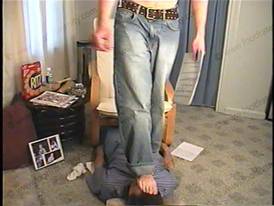 Bare-chested with pierced nipples, in jeans & white socks, Parker has his foot slave kneeling at his feet, at the end of the sofa, as he reads Chapter ONE of this training manual that gives him ideas and plans for the "Heterosexual Guy’s Training Manual for Sissys". He laughs at the book and ideas, which were set up by straight jocks on treatment and raising a foot sissy. He makes comments about them and decides how the slave must obey them as he has foot worship. Then removed for bare foot adoration as he gives humiliating orders & embarrasses his bitch sissy slave - domination, humiliation, verbal, teasing, then total foot worship, etc. He laughs at the slave as he shows his straight superiority & has his feet all over the face & keeps the slave underfoot. Much toe sucking, foot kissing and foot licking, toe wiggling, and more. The manual is filled with over a hundred embarrassing and humiliation ways for a straight guy to dominate a sissy foot slave. This cocky teenager forces the bitch to submit to the power of this athlete. HE LOVES the ideas of putting a foot sissy under his cocky feet & is very conceited about how good he looks. He REALLY likes this! He is extremely arrogant, cocky and uses total verbal abuse & teasing on the slave. He owns the slave now, & loves treating him like crap, calling him names and giving full foot action to a foot slave. He makes the bitch pay for the honor of serving his sweaty shoes, socks & feet. He completely humiliates, dominates the slave with over a hundred humiliating commands and orders. Very clever with verbal teasing and abuse – all while his young feet are in the face of his slave. Two views, one close up of the feet in the face and one full view.