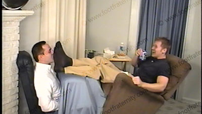 Taylor dressed up in dark dress socks, loafers and khaki pants. He has slave pinned at his feet while relaxing in lazy-boy chair. Taylor mocks him as he has to serve the loafers, socks and bare feet while Brock watches and makes comments about his brother Taylor & what he does to slaves. He teases and teases, humiliating the slave at his feet. He wipes his feet in the slave’s face, ordering adoration and worship. Slave removes shoes for much sock action. He laughs about the scene, making many cocky comments while slave sniffs his sweaty sox. Solid foot/face contact. Many humiliating comments as he totally dominates his sissy slave. Total sock and bare foot in the face. He teases, humiliates and dominates, and verbal abuse and constantly laughs and owns the control. Shoves his toes and feet into the bitch’s face. Taylor really teases and torments his sissy and calls him humiliating names as he has his bare feet & toes kissed, sniffed, sucked, licked & serviced. Brock makes comments thru the scene and laughs. Taylor comes up with ideas of his own and he humiliates his bitch in a commanding, cocky, arrogant, teasing manner. He realizes that he has more control simply because he is straight and has hot feet. Verbal talk & teasing. He reads an e-mail that he received from a Frat sissy slave, as they both laugh at it. This athletic jock forces him to submit to the power of his heterosexuality at his feet. HE LOVES the idea of the control he has with his jock feet. Toe sucking, and worship while Taylor shows his brother how to do it to a sissy. Toe wiggling, then cash put between his hot feet. Two views of this scene, one full length, one close up. He clips his toenails and gives the commands as to how they are to be worshipped. Much teasing foot power and domination. Very hot to have these brothers team up to do this to foot sissy sissys. They LOVE it, and want more and more each week!