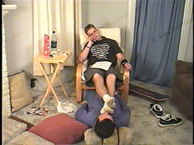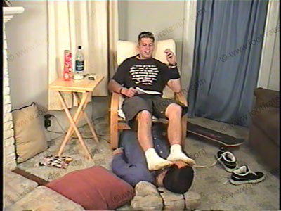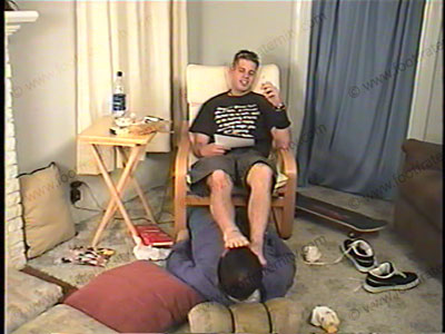 In shorts, sneakers & white socks, Parker has his foot slave under his chair, at his feet as he reads another e-mail from his straight buddy. It’s dominating, humiliating & embarrassing for the sissy to hear what Gene has to say & ask of Parker while serving his feet, socks & shoes. He just got in from skateboarding & is ready to abuse his sissy slave. He embarrasses him by total foot action, licking, toe sucking, much toe wiggling, solid feet in the face, sock sniffing, worship to this 18 year old guy’s hot feet. He humiliates the slave, as he has to do whatever Parker & Gene wants. This cocky teenager forces the bitch swallow his spit many times. HE LOVES the ideas of putting a foot sissy under his cocky feet & is very conceited about how good he looks! He is extremely arrogant, cocky & uses total verbal abuse & teasing on the slave. Hot dirty talk as he loves treating him like crap, calling him names etc. He makes the bitch give him new sandals. He completely humiliates, dominates the slave with hundreds of humiliating commands & orders – all while his young feet are in the face of his slave. Two views, one close up of the feet in the face & one full view. He demonstrates all that he can do to his slave, including spiting & much more. Total teasing, domination & foot worship of this young jock, in front of his buddy. He sits back, smokes while being paid to have his toe jam licked out. Total cocky humiliation & teasing from this teenage skateboarding guy.