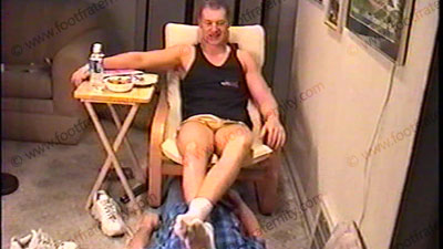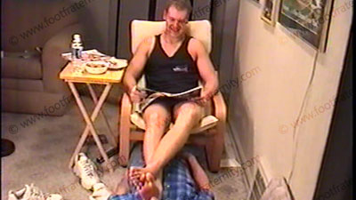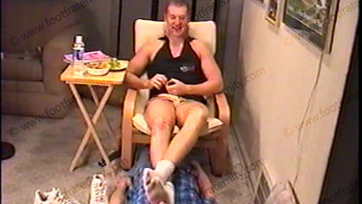 Taylor is in really dirty white sweat sox, very tight & short shorts, & sleeveless muscle shirt to show off his muscular chest. He has slave at his feet while relaxing in an easy chair. Genuine hot straight talk about what he does in the videos & what he does with his buddies & women. He has a regular conversation while his feet are in the other guy’s face & he is using him as a footrest. Taylor tells about his life, what he likes about doing the tapes for Fraternity slaves & what his plans are for the future. This is a REAL TV tape as Taylor smiles as he has his socks whiffed & services & bare feet action. He teases & teases, humiliating the slave at his feet all for real. He laughs about the reality, making many comments while slave sniffs his sweaty sox. Solid foot/face contact. Many comments as he totally takes this for real. Total sock & bare foot in the face. He teases & loves the control. He keeps his toes & feet into the slave’s face during the entire time. Taylor has his bare feet & toes kissed, sniffed, sucked, licked & serviced. HE LOVES the idea of the control he has with his jock feet & being paid for being straight & a jock. For real, he still wants gifts for allowing us to kiss & worship his feet. He knows that this is no longer a scene but a reality for him. Just a friendly conversation while talking about all kinds of topics. The control & power he has over us is real, & not just done for a video. He casually would look at a Playboy magazine while his feet are being sniffed, as he is just being his real self. Toe wiggling in the face during the conversation. Perfect size 13 macho feet that now require foot slaves to worship in real life. He truly likes this action, & really tells the truth, exposing all of his honest feelings. Very friendly & erotic tape yet it has his power & control as a straight guy. THEN he stomps grapes to make juice & has his foot lover suck up the juice that his sweaty bare feet had just stomped! Then a close up segment from another hot talk "for real" scene filmed two weeks earlier.