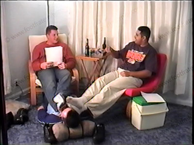 Dressed casual with lace up black shoes, these best friends have fun returning to show sissys where they belong in the Str8 man’s world while tossing back a dozen beers. They play a teasing game with by finishing "started" sentences with his response to how they think and treats their foot slave. Four macho feet in the slave’s face at one time thru the whole scene! Boots removed to sniff & worships sweaty white socks, then lick & kisses bare feet. The Masters try to out do each other in commanding the slave, yet are arrogant studs who lets guys PAY to worship at their feet & laugh & teases about it. They really love to shove their sweaty feet in our face. They get high & really torment & tease the slave underfoot. Verbalization & barefoot worship, with a close up view of the scene from a second camera angle. Good hot talk about why a str8 guy likes to have sissys worship their feet and follow commands. Master Roberto smokes cigarettes, & ashes in slave’s mouth. It’s humiliating, dominating & they love the power they have over us. They spit in the slave’s mouth, chew up snacks and spit them at him as well. Solid foot & domination as they both get into treating him like crap while they are treated as gods! Straight men Rule & give the commands & humiliating orders! Name calling, verbal, everything!