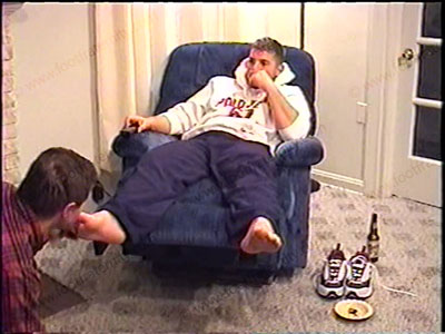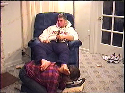In jeans, sweatshirt, & white socks JT relaxes in a Lazy-boy lounger, to try on some sneakers to replace his old ones. Just a few command, but mostly non-verbal after that as he watches a straight video while he has his bare feet serviced. Mostly bare foot scene – we have to lick his feet, kiss his feet & massaging. He ignores his slave while enjoy the hot women in the tape as his feet have a love scene of their own from his gay slave. He smokes while chillin’ to this life of a king! His meaty, macho football player feet we created to have someone make love with them. Close up & full length view of this film.