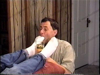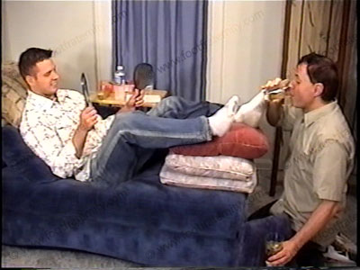 Water sports, drinking it, spitting many loogies in slave’s face & mouth & spittoon (slave must drink it), verbal teasing – he goes into being a god to completely dominate & control all of us with humiliation. In jeans, sweaty white socks, this arrogant, conceited, 18-year-old cocky jock has complete foot, sock & shoe worship. Full view and close up view. Total degradation & humiliation. He shows how Str8 Guys Rule. Orders, commands, teases, domination, spit, more piss, trampling, humiliation, laughing, tormenting his bitch slave, forced him to eat toenails clippings, spit food & more. His buddies really do call during the scene & he tells them about the foot worship! You can hear them on the phone, laughing! This scene is long so it’s continued on the following tape: