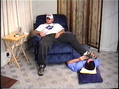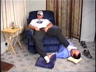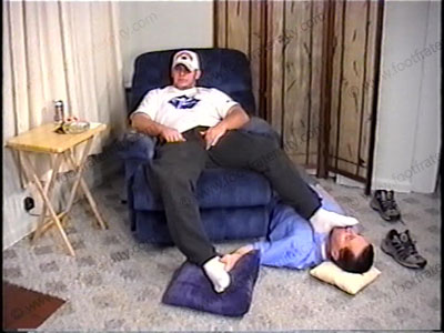 After workout, T-shirt, sweaty white socks, jeans, baseball cap & sneakers, JT sits back to have feet served. Socked feet sniffed & adored. Then bare feet & toes licked, kissed & sucked as he relaxes. Two views of this scene, one close up. He watches TV while foot love is happening. Then at the end, he is presented with a new pair of sneakers to replace his old ones.