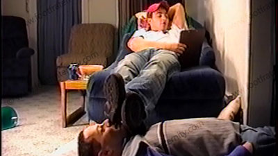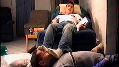 In T-shirt, sweaty white socks, Korie makes slave smell his socks as he hears truth of his foot slave & responds by with many comments. This is a REALITY TV film as there is no script but he talks for real about having foot slaves. He honestly loves it. This Str8 macho teenage stud chills & mocks his bitch, as he has his socks sniffed & worshipped & he dominates, humiliates & teases. Bare feet licked, kissed, toes sucked, eat toe jam etc., while loving his power. Two views of this scene, one close up. He is arrogant as he chills to the action with jock responses.