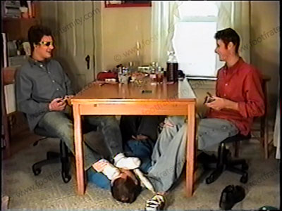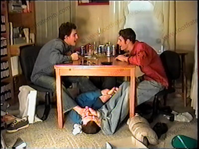 The tough, macho, jock buddies in jeans, sneakers, dirty white socks has bitch service their socks & feet as they play cards. Fun teasing as they laugh with the sissy under the table as they wipe their feet on him. They have a MAJOR spitting contest & laugh & chill with verbal teasing, laughing with four feet in the slave’s face. They do regular Str8 talk, often giving commands or laughing at the bitch. Two views of this, one full view, one close up. They know the power of the teenagers united with foot slave beneath their feet.