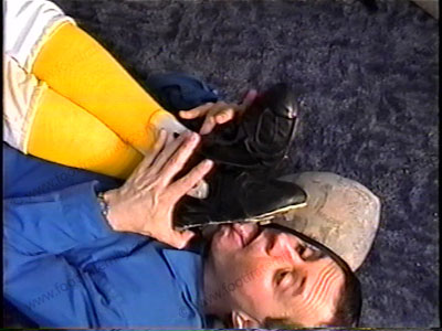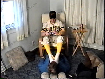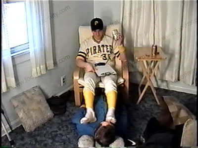 Sitting over slave in full baseball uniform, jock Adair makes a film to show his team mates of how he has foot slaves & what we do to pay for the honor of being teased under his feet & doing total worship. Socked feet wiped in his slave’s face, sniffed & adored with blackmail photos taken by Adair. Then bare feet licked, kissed, toes sucked & more, as he rubs his feet all over the face. Two views of this scene, one close up. Unmerciful foot teasing & dominating over his foot slave with constant foot in face action.