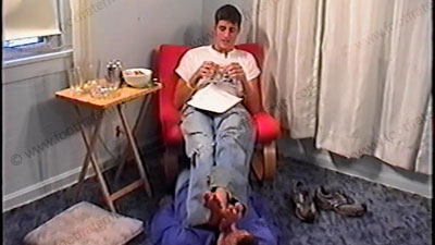 In jeans & sweaty white socks, Dirk goes tells the story of how his older brother is a foot slave to his feet. He tells experiences & situations now that he has this power over his brother. While telling “ALL” he is having foot worship, sock sniffing, bare feet licked, kissed, toes sucked & more. Two views of this scene, one close up. He teases & laughs at the power & control that he has over his own brother. He LOVES this power and the action at his sweaty, Str8, macho feet. He is “pimp” over his own brother & cocky as can be about this situation.