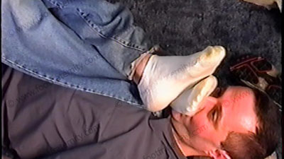 In jeans, baseball cap, sneakers & sweaty white socks, Dirk has the confession of how his older brother is a foot slave to his feet. His brother confesses everything about being in love with his younger bro's feet, sox, etc. While telling "ALL" he is having foot worship, sock sniffing, bare feet licked, kissed, toes sucked, ashing & more. Two views of this scene, one close up. He teases & laughs at the power & control that he has over his own brother. He LOVES this power and the action at his sweaty, Str8, macho feet. He is "pimp" over his own brother & cocky as can be about this situation. He has enough blackmail material to keep him at his feet for life. His talk and ideas are young & very hot.