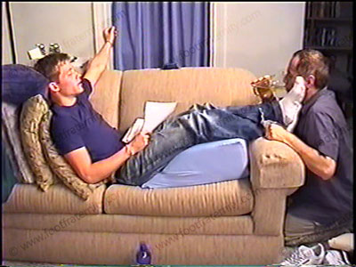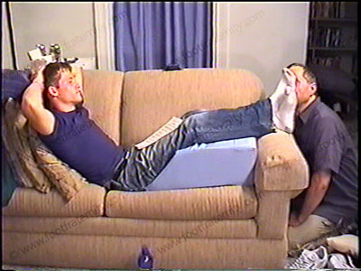 In T-shirt, jeans, white sweat socks, as he lays back with his foot bitch kneeling at his feet for worship, service of his sweaty socks & bare feet, Perry tells about how cocky he is to get anything he wants because of his good looks & Straight ability. He does water sports twice, forcing slave to drink it & is demanding, demeaning, verbal & enjoys the power of being a very cocky, Straight jock with sissys who pay to be humiliated by him while at his feet. Then bare feet & toes licked, kissed & sucked as he watches. Two views of this scene, one full, one close up. Total verbal teasing from a true jock, who likes this power, control & worship. Full attitude in this one. VERY HOT.