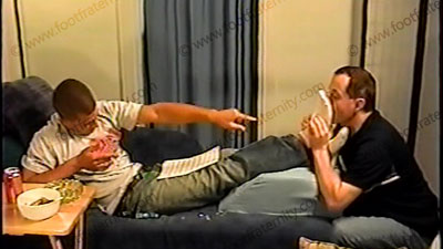 In jeans, sweaty short white socks, Korie removes his skateboard sneakers & teases his slave with his socked & bare feet while reading a list of slave’s fantasy predicaments that he wishes Korie would do. This macho, straight jock decided to make many of them come true, & loves to tease and place us all under his sweaty socked & bare feet. Then he just teases with his feet in his own way, water sports - drinking all, spit, clips toenails & places them on a pastry for slave to slowly eat while Korie laughs his ass off. Two views of this scene, one full, one close up. He laughs in a teasing friendly & fun manner. Ending with a short foot massage.