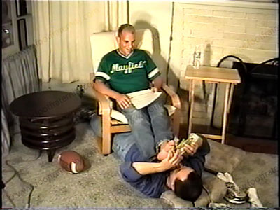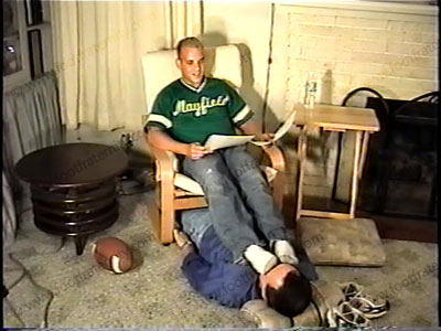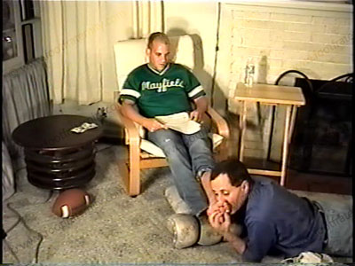 After football practice, he is dressed in uniform & sneakers, as he relaxes in chair with his foot slave pinned beneath his feet for the first service of his sweaty socks & bare feet worship. He is demanding, controlling, verbal & enjoys the power a slave humiliated by him while at his feet. Then bare feet & toes licked, kissed & sucked as he watches. Two views of this scene, one full, one close up. Total verbal from the start.