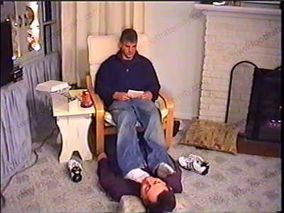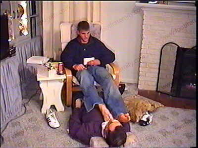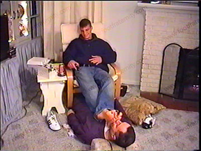 Cocky, conceited, collection of Colby controlling! In sneakers & really sweaty white sweat sox (worn during hockey practice) has his sissy underfoot in front after the scene with his real life brother. He embarrasses him by much foot action, licking, toe sucking, ashing, spit, sock sniffing, foot kissing & service to this high school senior captain of the hockey team. He humiliates & teases his slave underfoot. This 18-year-old guy loves this power at such a young age! His attitude is very true of today’s high school senior jocks! Then a close up of another of his films along with some filming of him having his cleats and baseball socks serviced after a baseball game.