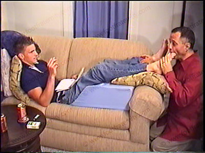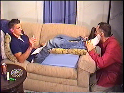 Lying down with his bitch kneeling at his feet, Hockey captain of his high school team, Colby is in jeans, sweaty white socks, chillin’ & smoking with his foot slave worshipping his feet for the first service of his socks & bare feet worship. He is teasing, verbal & laughs much as he enjoys the power of being a Straight senior Jock with slaves who pay to be humbled, dominated & humiliated by him while at his feet. Then much bare feet & toes licked, kissed & sucked as he watches. Ashing, Two views of this scene, one full, one close up. Total verbal teasing as he smiles and laughs at his newfound power.