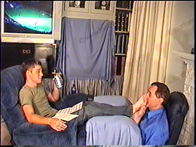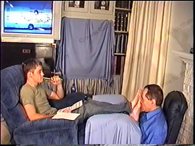 In jeans & white socks, Perry (while football game is on TV) is cocky & powerful as he tells how he rules over foot sissy brother. He discovered that his brother has a fetish for Perry’s feet by accident and then Perry uses this info for his advantage. He tells all that he does and will do to the guy while having foot service & teasing his foot bitch who is pinned under his feet the whole time. Sock sniffing, bare feet licked, kissed, toes sucked & more. Two views of this scene, one close up. He is powerful, funny, teasing & laughs as he tells about blackmailing his bitch brother. Perry in this one with the power of his brother who he now has at his feet! HOT!