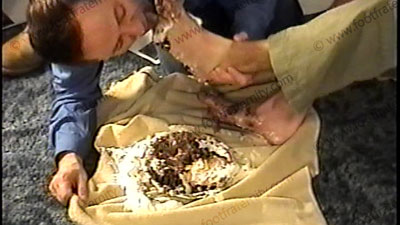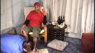In scenes Drake laughs, controls & teases his slave underfoot for the service & worship. Drake fills slave’s mouth with cigarette butts, burns his baseball rookie card of a star, long messy step in pie scene, lick it from feet, then wiped over slave’s shirt & face, then sissy cleans his feet, he does water sports in glass, makes slave drink it, takes calls, his toes sucked clean, spits in mouth close up. Two views, one full, one close up. Next a hot scene of Korie, on the sofa bare chest), in jeans, sneakers, white sweat socks as he tells how he humiliates his foot slave brother who is in love with straight Korie’s socks & feet. Then he describes some humiliating slave service pictures & gives his comments. During the talk, his feet are services, socks sniffed, licked & kissed, bare foot action of licking his feet, kissing, & more. He teases in a very friendly, joking manner while getting foot love.