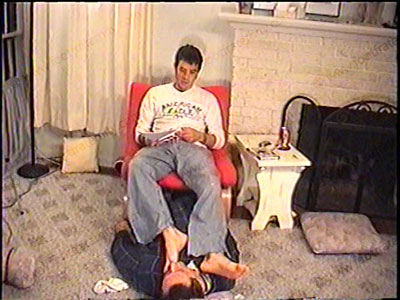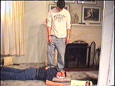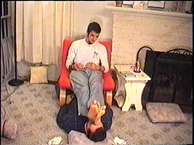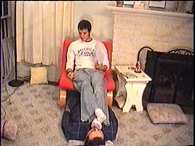 In jeans, sweaty white socks, Addison humiliates his slave with his socked & bare feet while telling how fair it is to have a bitch to dominate. He is mean & commanding to his slave – bitch slaps, spits, a long period of trampling in bare feet, & more. Sock sniffing, bare foot licking & worship. This macho, straight jock loves to dominate and place a sissy under his feet & humiliates in strong & different ways. Two views of this scene, one full, one close up.