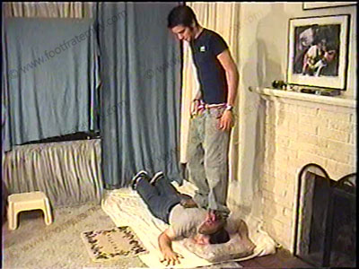 In jeans, work boots, tight Under Armor T-shirt, this macho Hockey player first tramples his bitch under his dirty boots. Then he goes on a stomp rampage, stomping electronic things, Brand new VCR, DVDs, Brand new printer, glasses, watch, and many more expensive things. This straight jock does a number in Stomping & trampling & humiliating his slave. His boots are kissed after each time the Master stomps an item. Two views, one full length, one close up.