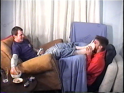 This strong Stud relaxes at home in, sweaty white hockey socks, jeans, sneakers as he makes the captain of the Hockey team into his foot slave! Stan is whiffing his buddy’s sweaty socks, licks his sneakers, & kisses, smells & serves Master Spike’s sweaty bare feet & more. Both are 18-years-old & straight! Spike mocks him, laughing throughout the scene & teases his hockey teammate, while realizing the power he now has with his feet & his slave. Much verbal with constant foot worship, spit & teasing, etc. Totally embarrassing for handsome Stan to be the foot slave to his high school teammate. This is the first time one Str8 Frat model served the feet of another! After two views, then all the guys sittin’ around chillin’ “for real” afterwards.