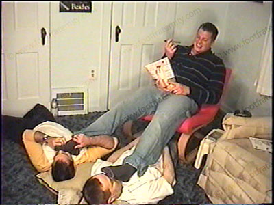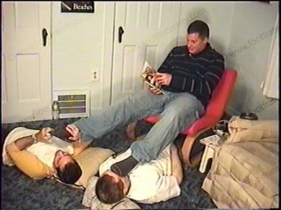 Jake looks at magazines, smokes cigars, ashes in one’s mouth as Shawn & Darren make love to his hot socked feet. He is wearing gray dress socks with gold band around the toe. Then some bare foot kissing & love, followed by more sock service. He teases, laughs and maintains that he has control over us as we have to make love to his big hot size 13 meaty feet. Two views of this scene – one close up. He is in total control of his slaves as they each make love to one of his feet.