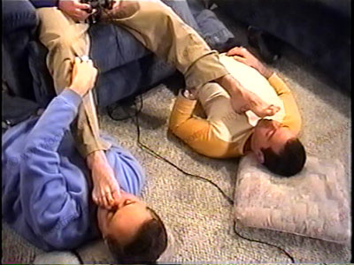 SKYLER PLAYS TV VIDEO GAME WHILE TWO GUYS MAKE LOVE TO HIS FEET