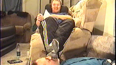 In work out pants, T-shirt, sneakers, white sweaty athletic socks with sexy gray on the soles, with his sissy slave lying at his feet, super macho, well built Taylor, on the sofa, dominates & takes control of his bitch. He responds to comments while his foot slave is beneath his feet in service of his sweaty socks & bare feet worship. He is verbal & controls with the power of a Straight Stud. Then bare feet & toes licked, kissed & sucked while he laughs, teases and tells what he likes about being Straight with slave foot slaves. Two views. Total verbal teasing & foot control while he chills. He makes slave lick his sweaty feet, then wipes them all over his face. He is a natural at this. Super macho & lovin’ the power at his size 13 feet.