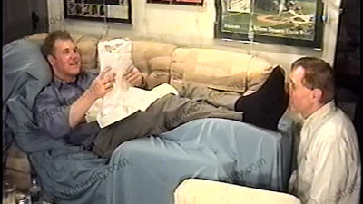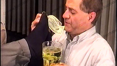 With slave kneeling at his feet, Taylor dressed up with loafers, dark gold toe socks, relaxes on sofa for total love making of his sweaty socks, then the bare feet: smells socks, teases him, rubs feet in face. He describes his new web site of his foot worshippers, the rules & his power in teasing yet controlling manner of all foot slaves. His socks are serviced, sniffed, licked then his size 13 barefoot licking, kissing the soles & toes & toe jam. Water sports, and more. Total foot action during the scene. He gets another fan letter from Mia, filled with adoration & ideas for serving this heterosexual stud. Two views, one full, one close up. He truly wants this service on a regular basis & commands gifts & payments. Total teasing with humiliation.