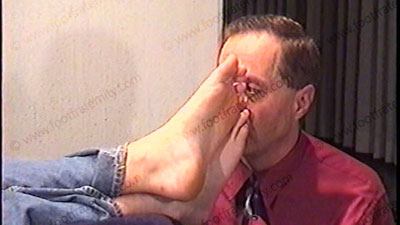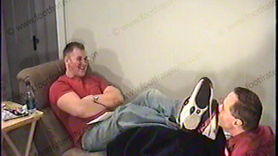 In sneakers, sweaty white socks, tight T-shirt, & on easy chair with slave underfoot, Taylor gives the testimony of His new religion for foot slaves who worship his feet & make him their god. He gives his dominating response, laughs, teases, gives many orders & commands of all kinds of domination. He starts with his socks serviced, sniffed & worshipped as he talks. Then feet licked, kissed, toes sucked & more, as he rubs his socked feet all over the slave's face during the scene. His cocky, very straight, Republican, arrogant, attitude is of our god. Two views of this scene one from side, one close up. Get on your knees & pray to His feet as he laughs in your face.