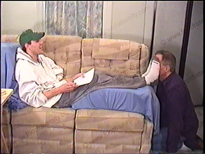 After work, he is dressed in hoodie, slacks, short white sweat socks, as he relaxes on the sofa with his foot slave at his feet for the first service of his sweaty socks & bare feet worship. He is teasing, controlling, demanding, demeaning, verbal & enjoys the power of being Straight jock with sissys who pay to be humiliated by him while at his feet. He ashes in slaves mouth, puts out over 6 cigarettes on the sissy’s tongue, along with bare feet & toes licked, kissed & sucked as he watches. Eating toe sweat, spit in face, much laughter, complete domination. Two views of this scene, one full, one close up. Total verbal abuse & control from the start. He does this naturally and LOVES the power trip at his feet. He is a natural.