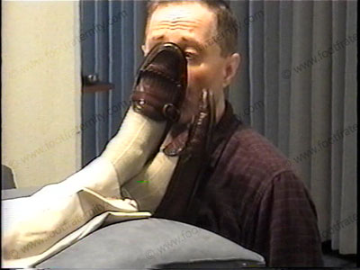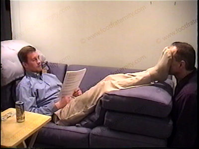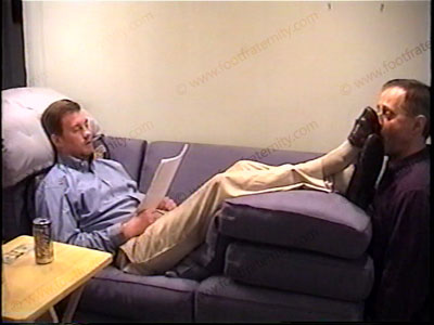 After work, he is in a dress shirt, and slacks, tan businessman socks & cordovan kiltie loafers, as he relaxes with his foot slave kneeling at his shoes for worship. After licking the shoes, sock sniffing foot kissing & bare foot service. He gives comments, commands, teases, takes a nap while slave makes love to his feet, relaxes to being worshiped & takes power over submissive guys. He is cocky, arrogant, Republican with guys who pay to be his foot slave. Two views of this scene, one full, one close up. His conservative nature expects foot worship, massage & service as he is on the sofa Slave takes photos of himself serving the feet of this executive. Foot massage.