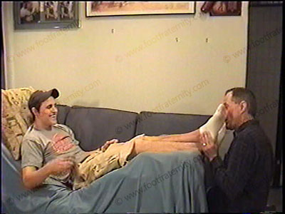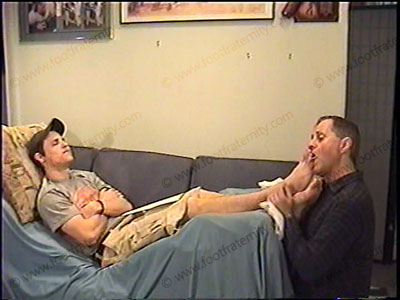 In shorts, T-shirt, short sweaty white sox, Jaret, relaxes on sofa with his foot slave serving his feet in sweaty socks & bare feet worship. He is telling YOU, (looking in the camera) about having foot slaves as he demonstrates his control & power for being a cocky, Straight hockey jock with sissys who pay to smell his feet. Takes his calls while keeping his feet in slave’s face. Then bare feet & toes licked, kissed & sucked. Two views of this scene, one full, one close up. Teasing, laughing, smiling, & loving his power as he has foot slaves for just being straight. He chills & relaxes while love is made to his feet. He REALLY likes this.