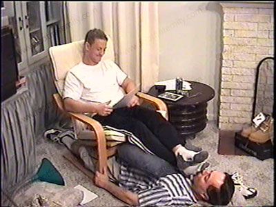 In his work out pants, sneakers, shirt & sweaty white socks, this boxer just chills in a friendly manner, teasing the guy with his feet then using him for a while as a foot stool while reading Playboy magazines. Relaxing, with comments, his feelings and thoughts while his socked feet are in the slave’s face for sniffing & worship, then bare foot action of all kinds in the face. A friendly, foot love tape from this hot athlete. Two views, one full, one close up.