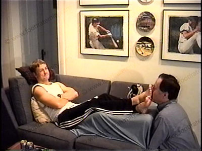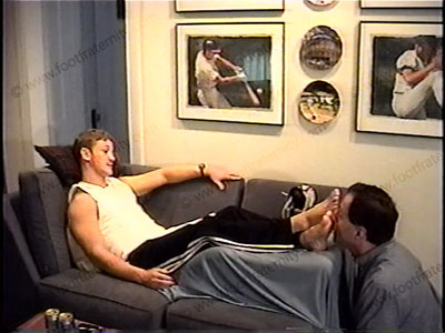 In his work out pants, wife-beater, sneakers & sweaty white socks, this boxer finishes sentences about what foot slaves should do & why they must serve straight guys like him. With slave serving at his feet, he laughs, teases, smiles & has fun responding what he really believes about foot slaves while wiggling his socked & bare feet are in his slave’s face. Complete foot worship during whole scene. One close up view one full length. He just lays back, watches, laughs & enjoys having love made to his sweaty socks and feet. He teases slave’s face with his feet whole time.
