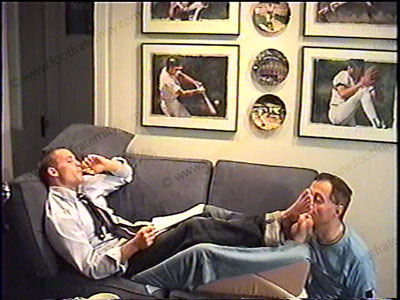 With his sky blue eyes, military short haircut, shirt & tie, dark Tommy H. dress socks, this Abercrombie & Fitch model lays on the sofa telling all about his life as a Foot Frat model while true life slave is doing worship of his feet. 90% of this film is of Perry in his sweaty dark socks. (Just a bit of barefoot action.) He teases & torments the foot licker who is kneeling at his sweaty socked feet. He laughs, teases, orders foot sniffing, barefoot action & loves the fact that he can control many lives with his straight feet. He ashes, spits, verbal abuse, water sports, butt talk, takes much foot worship & knows how hot he is & what control he has over us. Solid foot worship & teasing. Two views – close up & full during this scene of making love to Perry’s dress socks and feet.